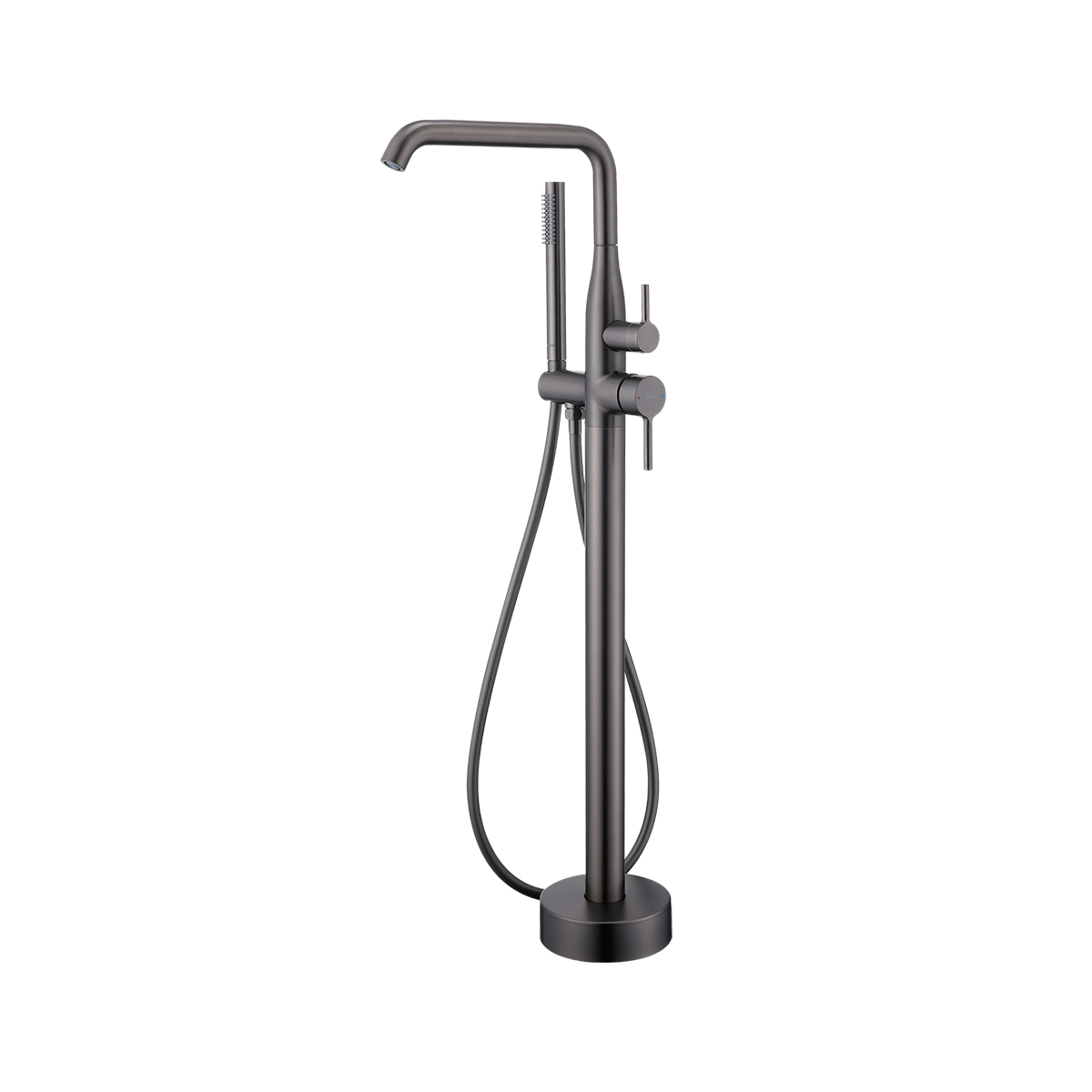 Смеситель имеет напольный монтаж и комплектуется гибкой подводкой длиной 70 см, что облегчает установку. В комплект также входят душевая лейка, шланг и крепеж.